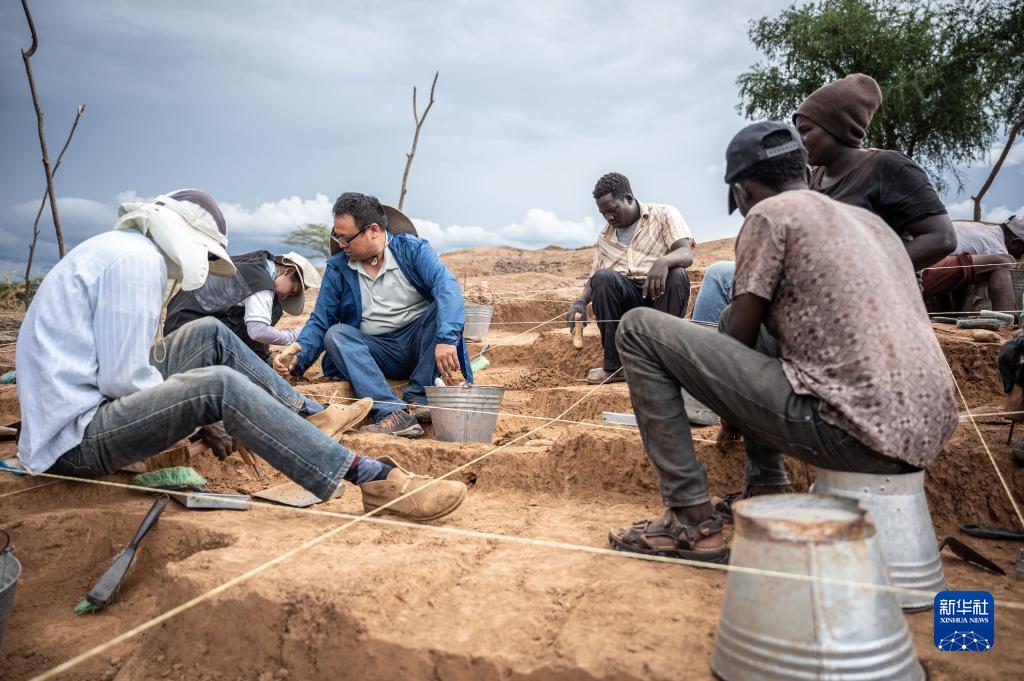11月3日,中肯聯(lián)合考古隊隊員顧雪軍(左三)在位于肯尼亞巴林戈郡馬里加特鎮的考古現場(chǎng)進(jìn)行發(fā)掘工作。