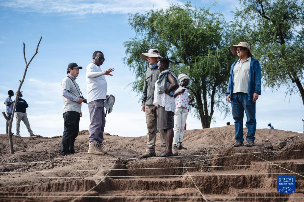 11月4日,中肯聯(lián)合考古隊隊員在位于肯尼亞巴林戈郡馬里加特鎮的考古現場(chǎng)交流。