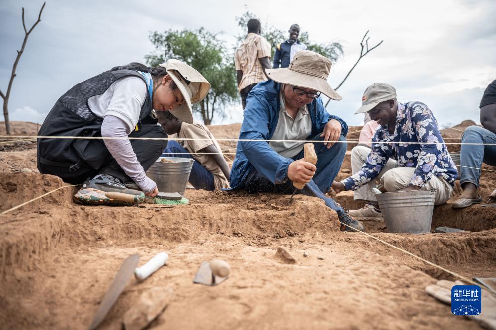 11月3日,中肯聯(lián)合考古隊隊員彭勝藍(左)和顧雪軍(中)在位于肯尼亞巴林戈郡馬里加特鎮的考古現場(chǎng)進(jìn)行發(fā)掘工作。
