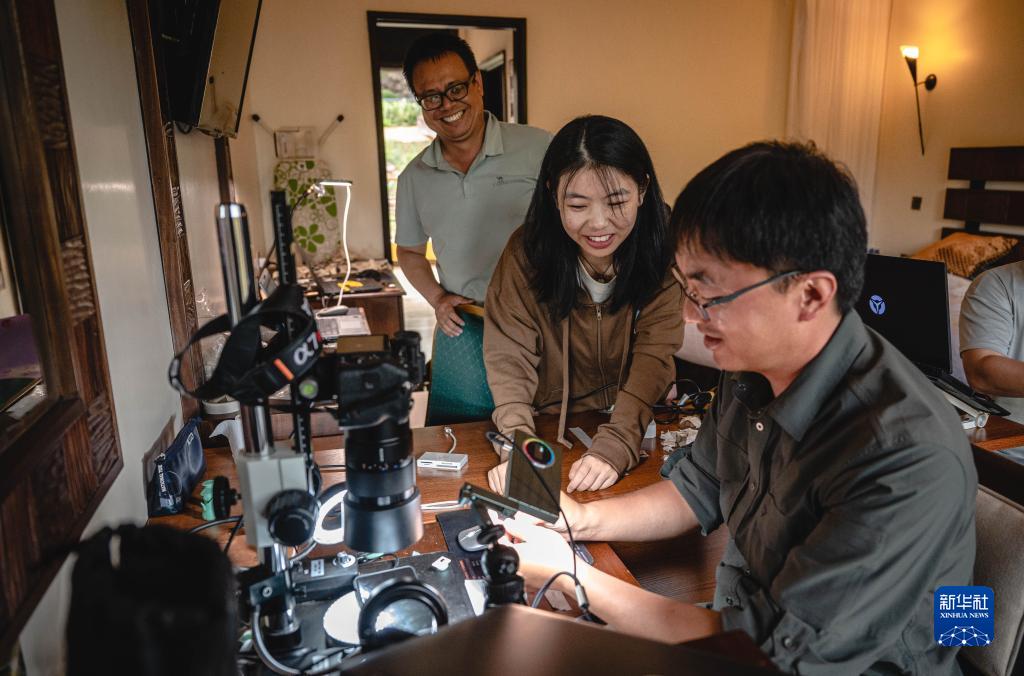 11月3日,中肯聯(lián)合考古隊中方現場(chǎng)負責人趙清坡(右)與隊員彭勝藍(中)、顧雪軍(左)在位于肯尼亞巴林戈郡馬里加特鎮的臨時(shí)駐地內進(jìn)行交流。