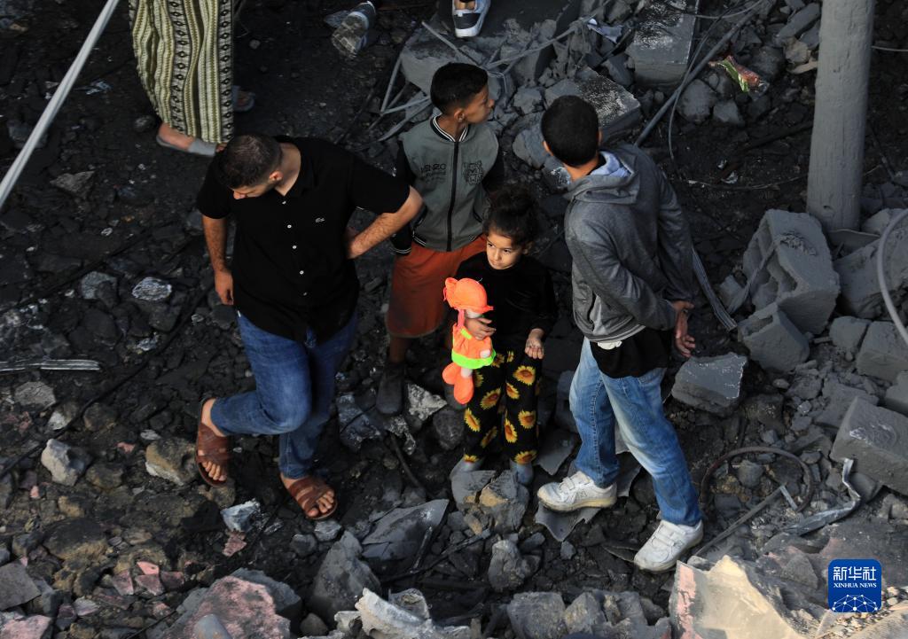 11月5日,在加沙地帶中部的代爾拜拉赫,人們聚集在遭以色列轟炸后的邁加齊難民營(yíng)。