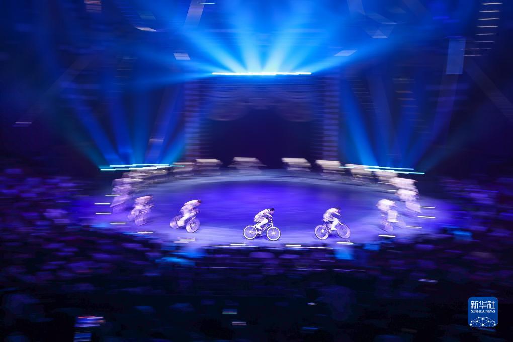 中國雜技團演員表演創(chuàng )新節目“逐風(fēng)者·男子集體車(chē)技”,綜合運用翻騰、頂功、拋接等技藝(11月5日攝)。