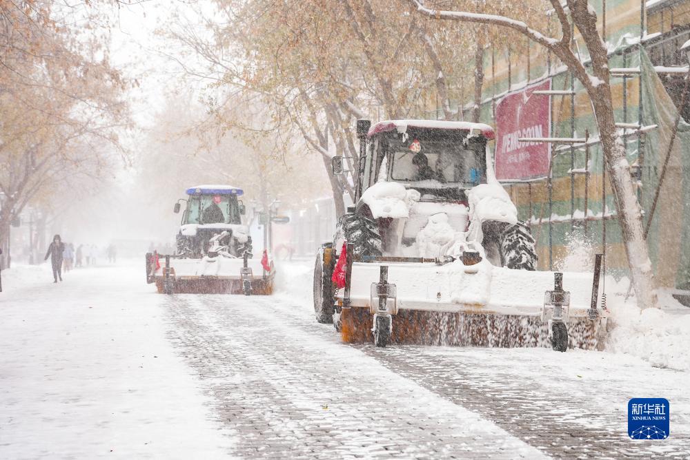 11月6日,清雪車(chē)在哈爾濱中央大街上鏟除積雪。