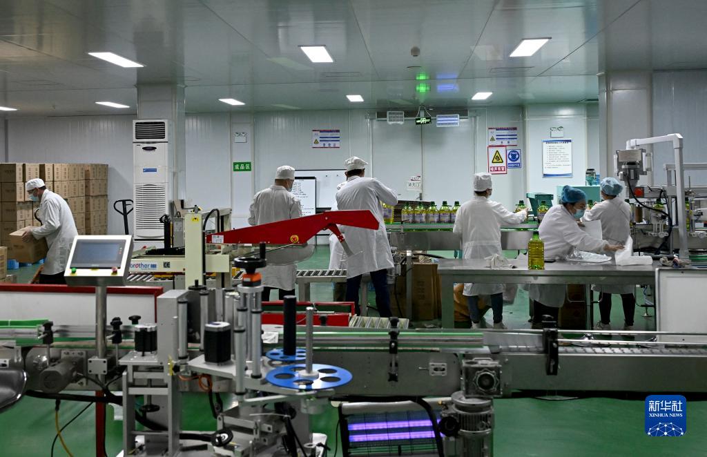 11月4日,在阿拉山口綜合保稅區內的阿拉山口金牧生物科技有限公司,工作人員在包裝亞麻籽油。
