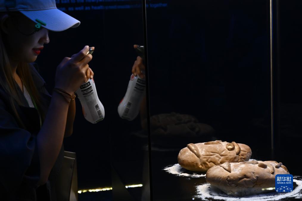 11月6日,參觀(guān)者在第六屆進(jìn)博會(huì )國家展塞爾維亞展臺欣賞展出的塞爾維亞面包。