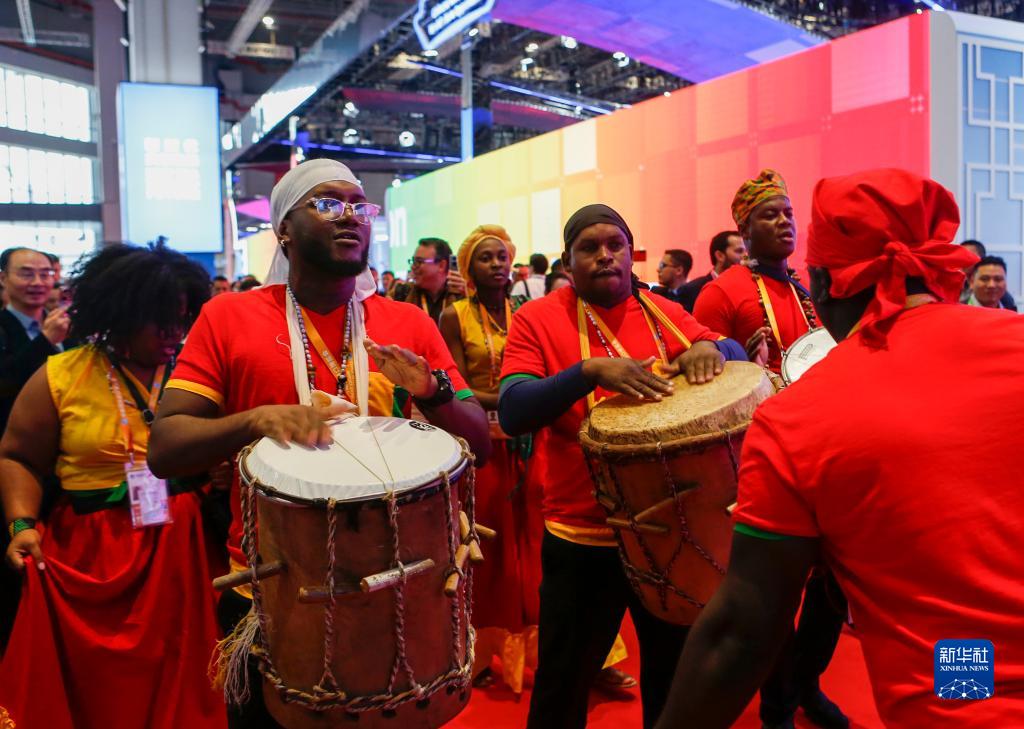 11月6日,來(lái)自第六屆進(jìn)博會(huì )國家展洪都拉斯展臺的演職人員在現場(chǎng)進(jìn)行文藝表演。
