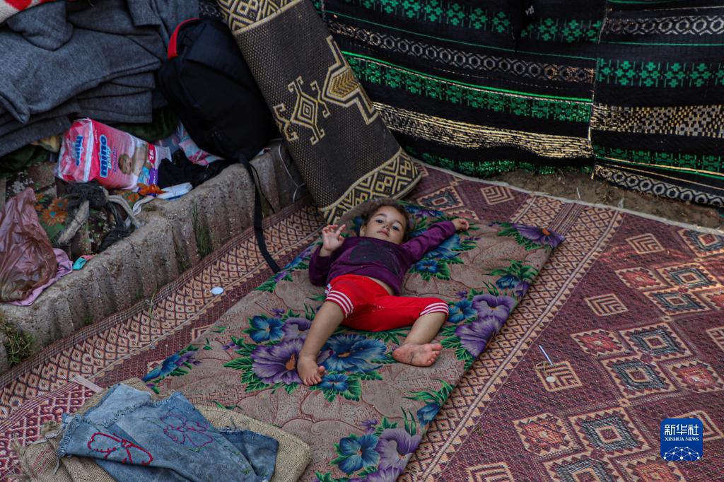 11月6日,一名兒童在加沙地帶南部城市汗尤尼斯的一處臨時(shí)難民營(yíng)內休息。