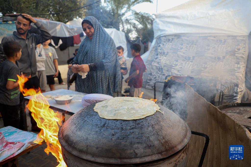11月6日,因缺乏燃料,在加沙地帶南部城市汗尤尼斯的一處臨時(shí)難民營(yíng),人們用粘土砌成的爐子烤制面包。