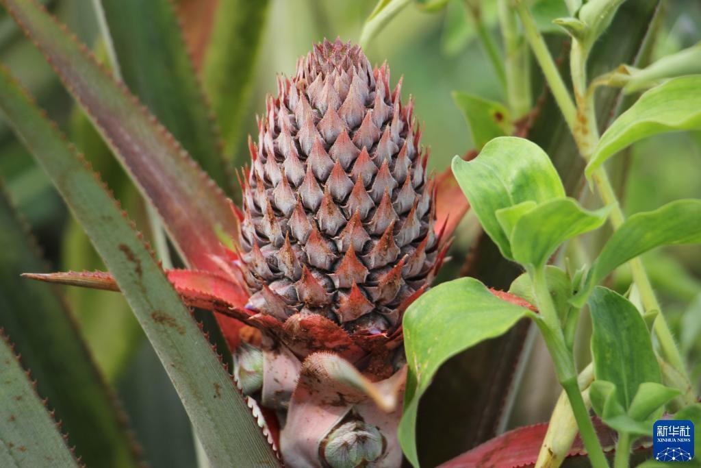 這是10月23日在的貝寧“甜面包”菠蘿主產(chǎn)區澤鎮拍攝的正在生長(cháng)的菠蘿。