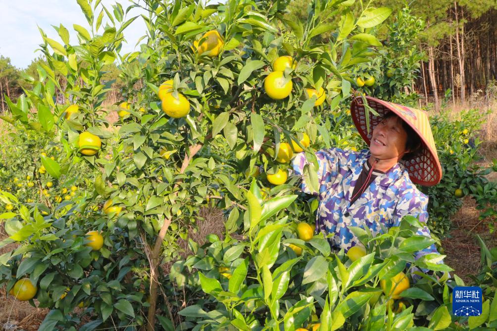 11月6日,在湖南省永州市新田縣金盆鎮柑桔產(chǎn)業(yè)示范園,果農給沃柑撐果、剪枝。