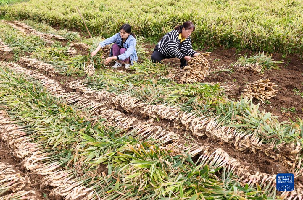 11月7日,在貴州省銅仁市玉屏侗族自治縣平溪街道馬頭田村,農民在田間收獲生姜。