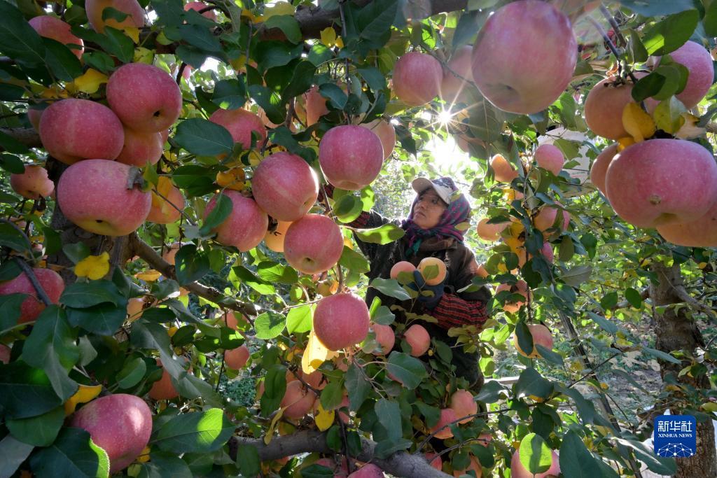 11月7日,在河北省灤州市王店子鎮臥龍谷生態(tài)農業(yè)科技園區,果農在采摘蘋(píng)果。