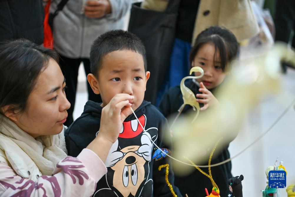 11月7日,小朋友在2023黃河非遺大展上體驗吹糖人。