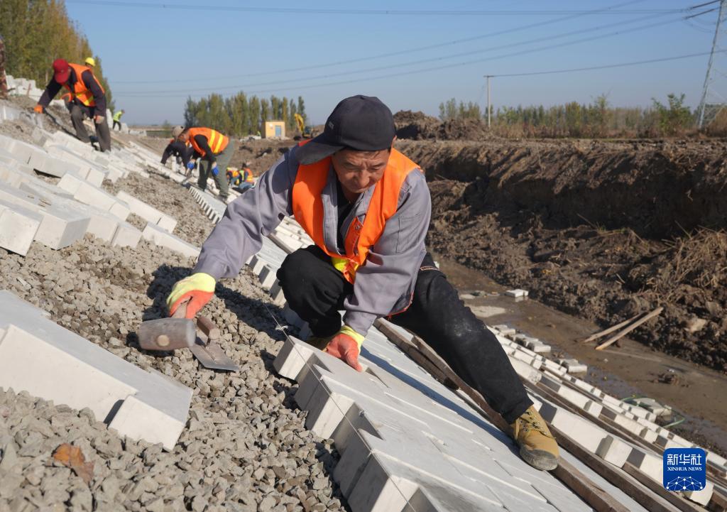 11月7日,工人在唐山市豐南區王蘭莊鎮彭家莊村灌溉水渠護坡加固工地施工。