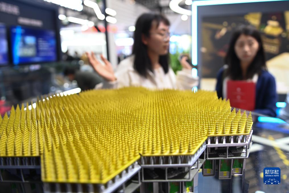 11月7日,觀(guān)眾在之江實(shí)驗室展臺了解射頻相場(chǎng)望遠鏡核心單元。