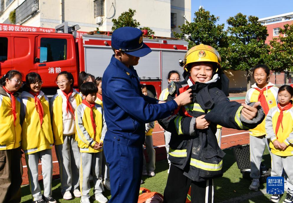 11月7日,在山東省棗莊市臺兒莊區實(shí)驗小學(xué),小學(xué)生在消防救援隊員的指導下體驗穿戴消防服裝。