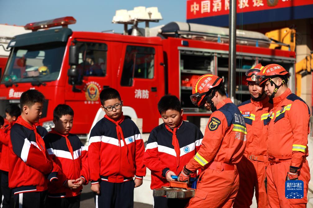 11月7日,河北省邢臺市任澤區昌平路小學(xué)的學(xué)生體驗使用消防救援器材。
