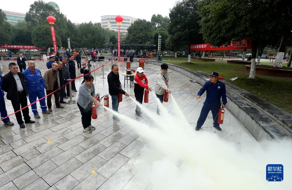 11月7日,在湖南省資興市人民廣場(chǎng),消防救援隊員指導市民使用滅火器。