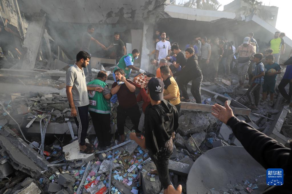 11月7日,在加沙地帶南部城市汗尤尼斯,人們在遭到以色列襲擊的建筑廢墟上實(shí)施救援。