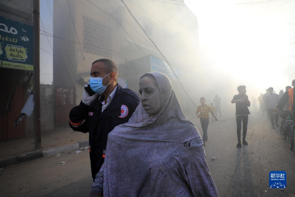11月7日,在加沙地帶南部城市汗尤尼斯,人們在遭到以色列襲擊的建筑廢墟上實(shí)施救援。
