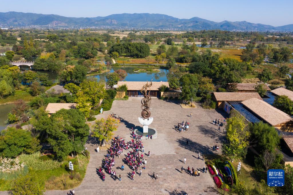 11月7日拍攝的良渚古城遺址公園入口(無(wú)人機照片)。