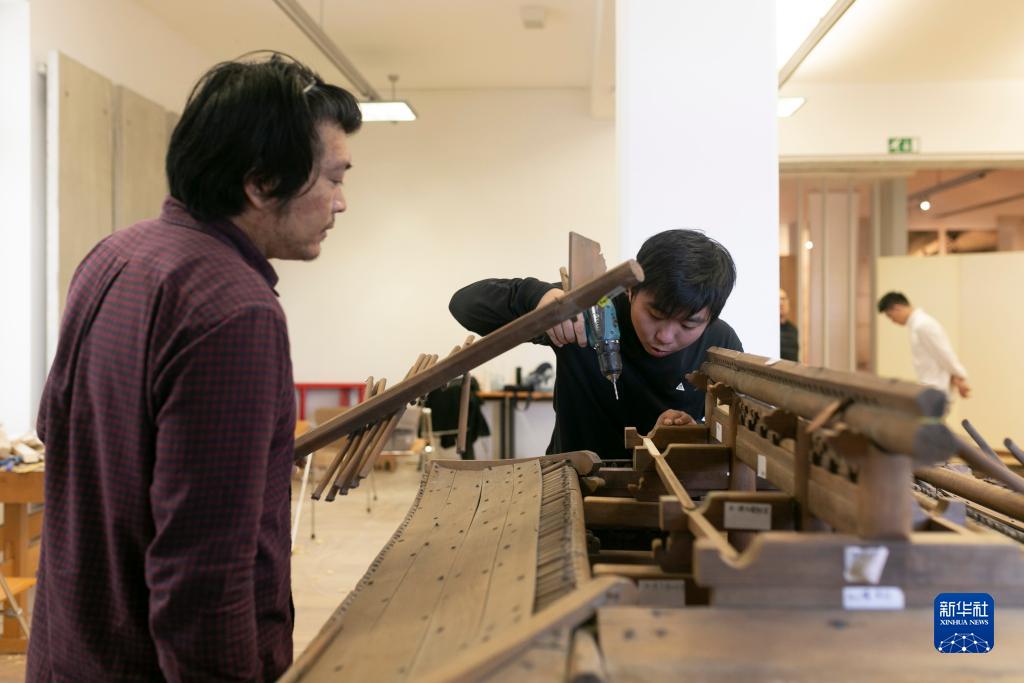 10月16日,在斯洛文尼亞盧布爾雅那的民族志博物館,故宮博物院專(zhuān)家鮑杰(左)和史孫明修復中國古建筑木質(zhì)大門(mén)模型。