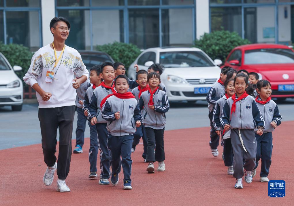11月8日,湖州市月河小學(xué)教育集團吉山校區的學(xué)生們在老師的帶領(lǐng)下進(jìn)行慢跑。