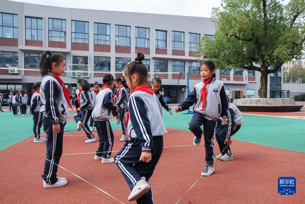 11月8日,湖州市月河小學(xué)教育集團吉山校區的學(xué)生們在課間跳皮筋。