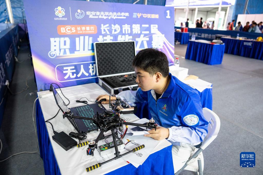 11月8日,在長(cháng)沙賀龍體育中心,參賽選手在進(jìn)行無(wú)人機裝調檢修項目的比拼。