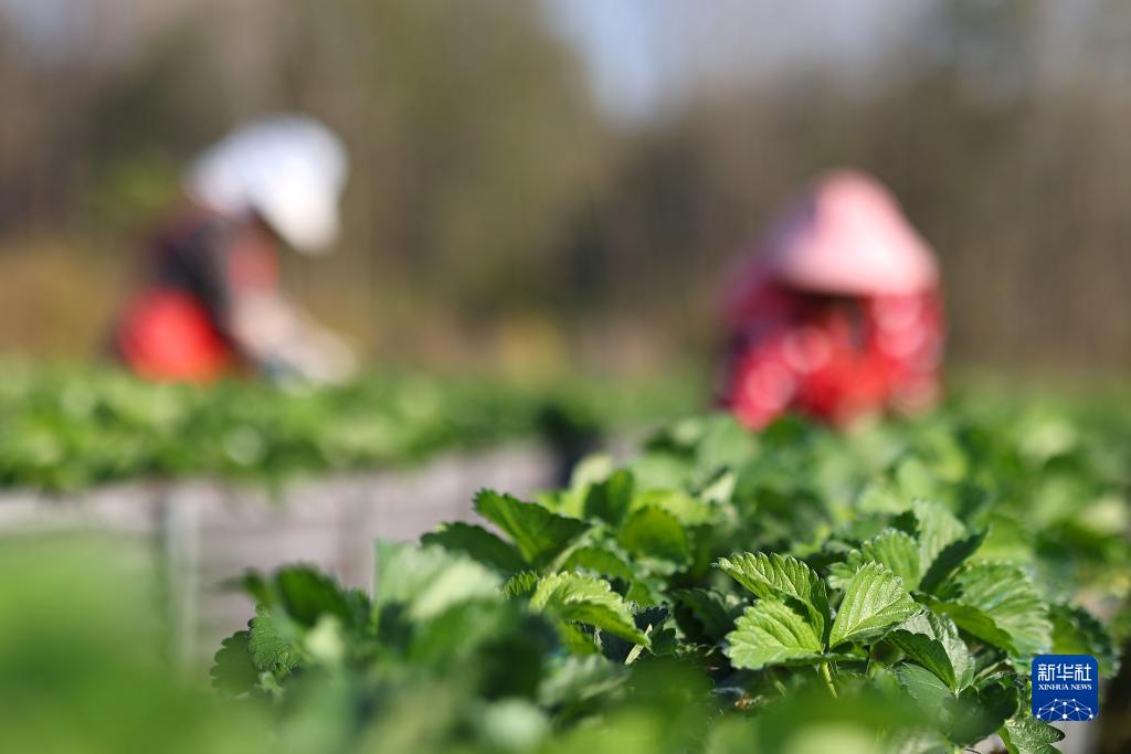 11月8日,江蘇省鎮江句容市下蜀鎮亭子村農民在管護草莓苗。
