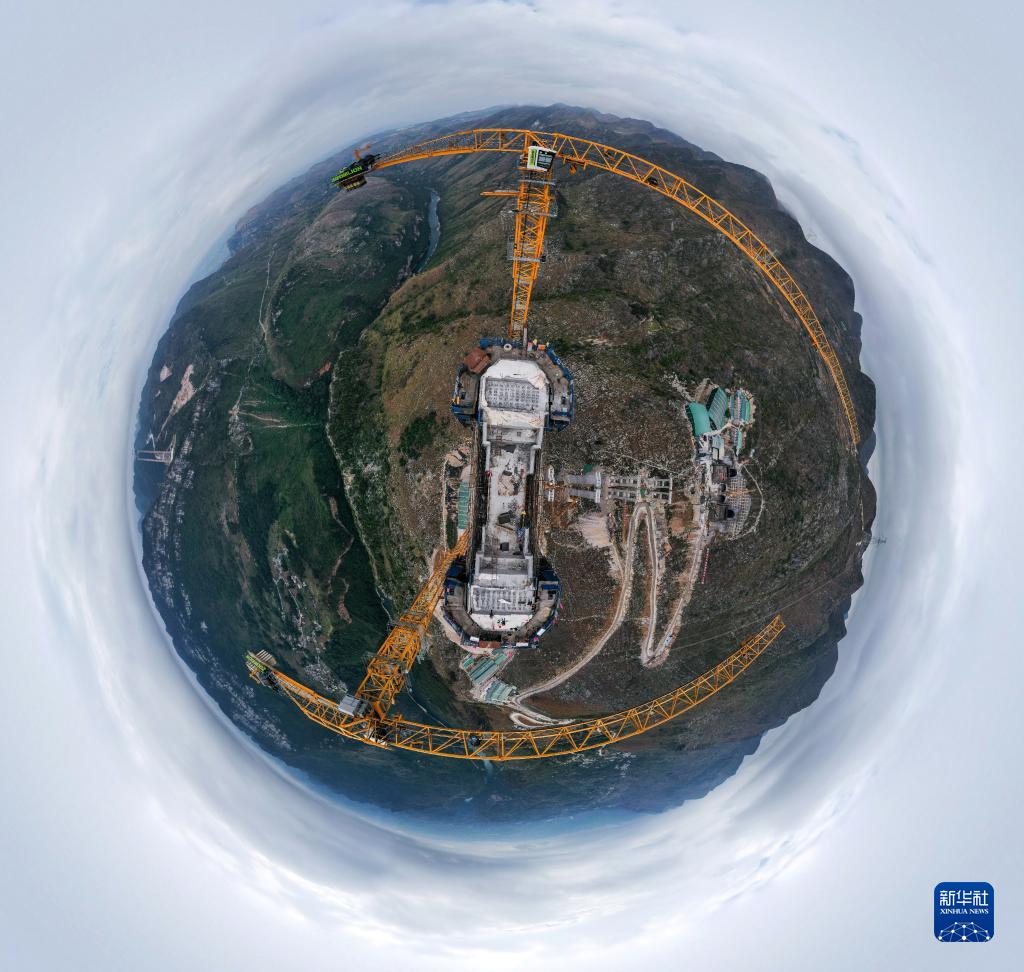 這是11月8日拍攝的貴州六安高速花江峽谷大橋建設現場(chǎng)(無(wú)人機全景照片)。