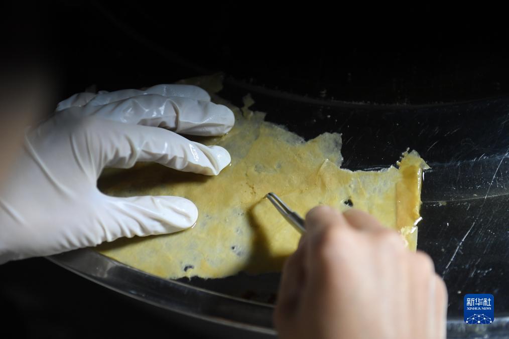 11月9日,工作人員在開(kāi)化紙傳統技藝工坊對修復用紙進(jìn)行人工除雜。