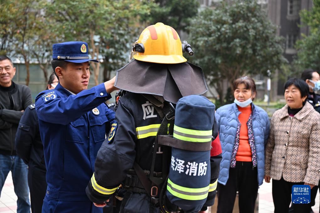 11月9日,在江蘇省淮安市洪澤區高良澗街道潤園小區,居民在消防員幫助下穿戴消防裝備。
