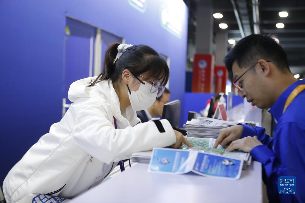 11月7日,在第六屆進(jìn)博會(huì )引導臺,上海外國語(yǔ)大學(xué)志愿者章璇(左)為參觀(guān)者指路。