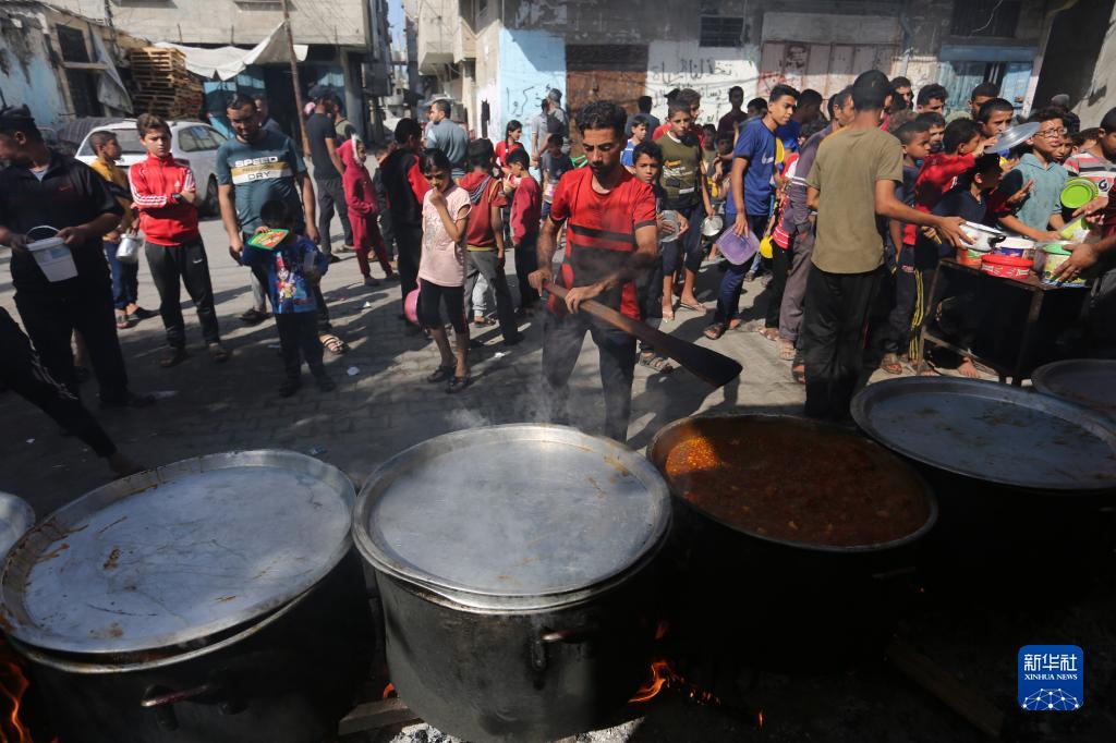 11月9日,在加沙地帶南部城市拉法,人們在一個(gè)臨時(shí)分發(fā)點(diǎn)排隊領(lǐng)取食物。