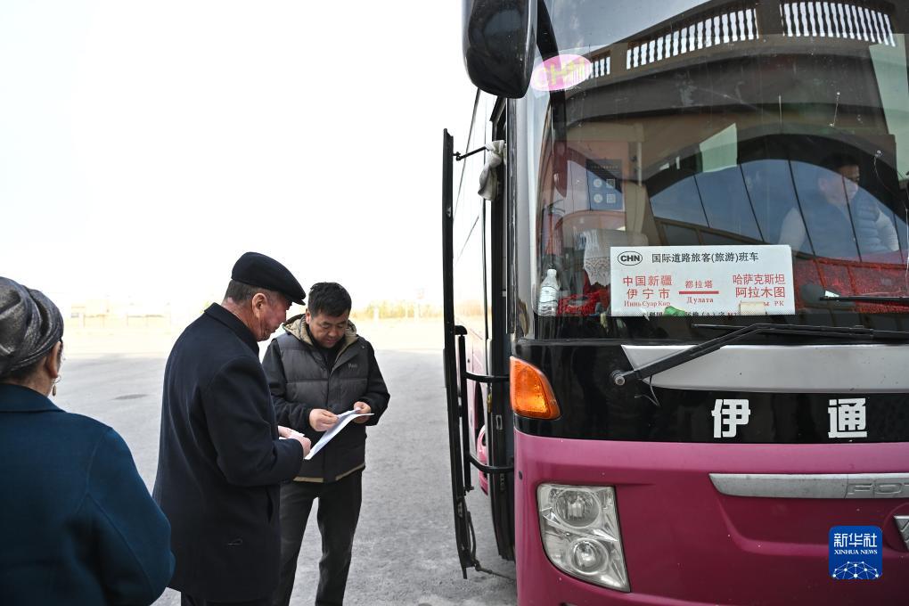11月9日,游客在都拉塔口岸國際汽車(chē)客運站檢票登上前往哈薩克斯坦的客車(chē)。