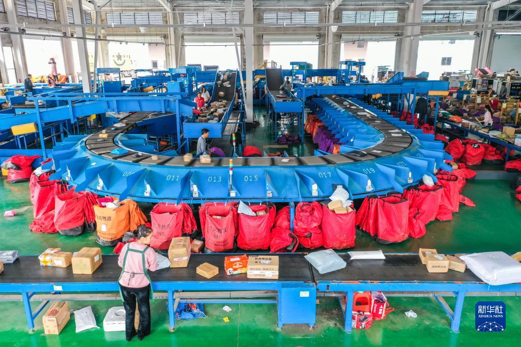11月8日,湖南省永州市藍山縣創(chuàng )品國際智慧物流園,工作人員在智能分揀作業(yè)線(xiàn)上忙碌(無(wú)人機照片)。