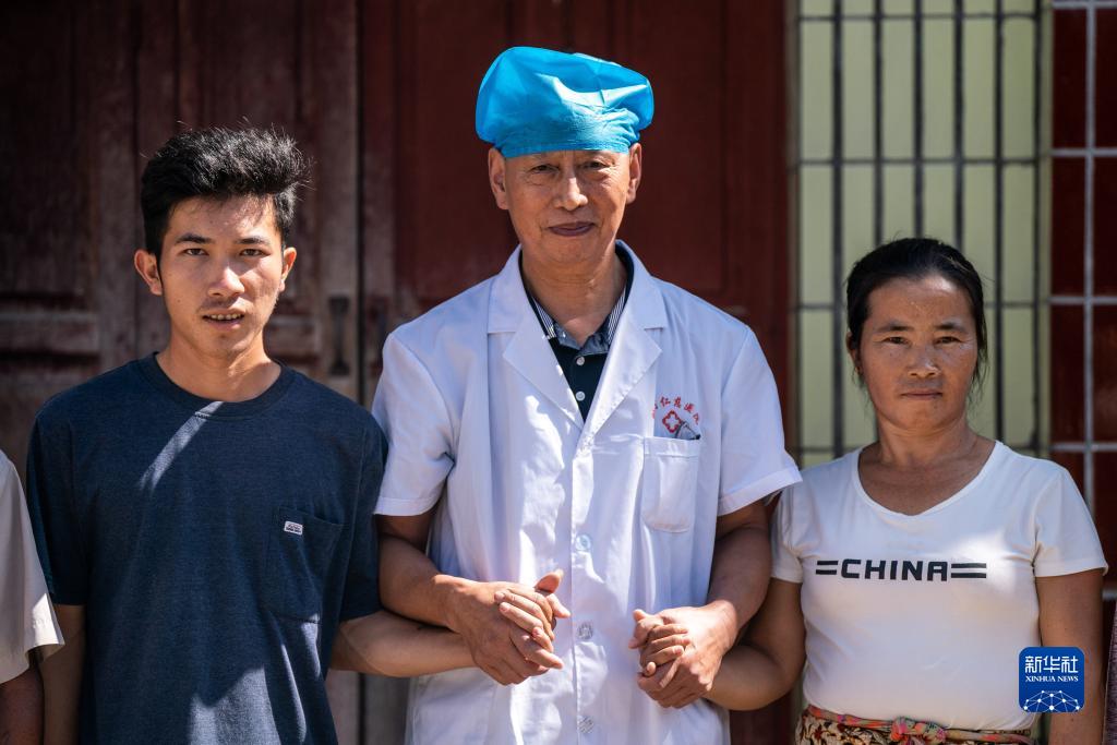 在瑞麗市畹町鎮混板村委會(huì )弄片村民小組,沈坤在家訪(fǎng)后與村民合影(10月28日攝)。他在二十年前接生的小男孩(左)已長(cháng)大成人。
