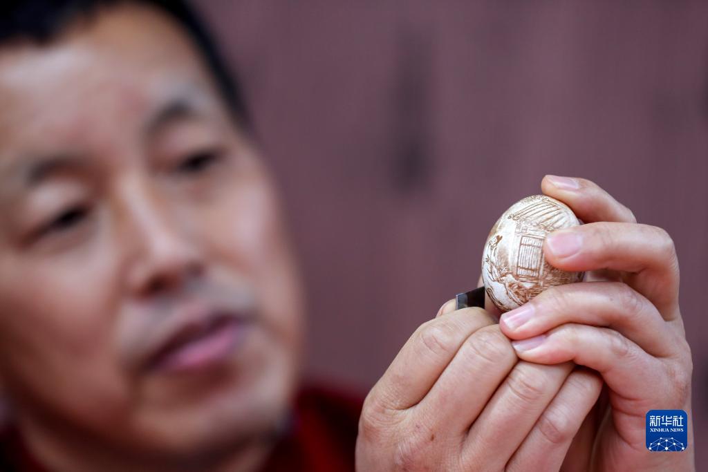 11月10日,非遺傳承人王劍在第六屆中國非物質(zhì)文化遺產(chǎn)傳統技藝大展上展示“廬州蛋雕”非遺傳統技藝。