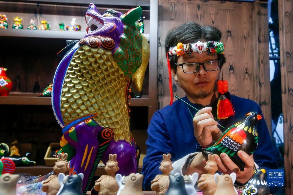 11月10日,非遺傳承人王紅瑞在第六屆中國非物質(zhì)文化遺產(chǎn)傳統技藝大展上展示“??h泥咕咕”非遺傳統技藝。