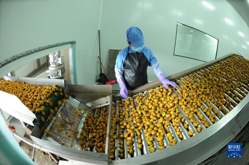 在貴州省龍里縣高新技術(shù)產(chǎn)業(yè)園區一家刺梨加工企業(yè),工人在傳送帶上篩選刺梨鮮果(2018年8月23日攝)。