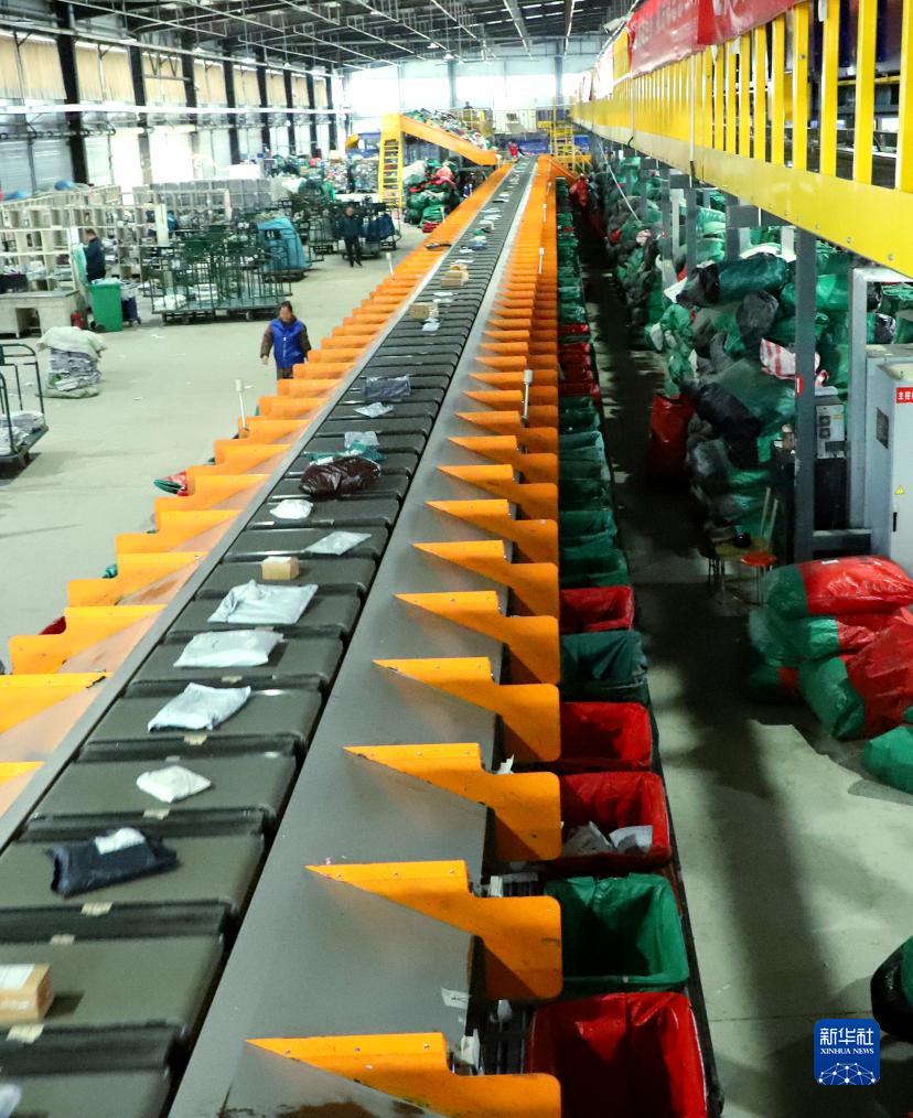 11月11日,在河南省南陽(yáng)市郵件處理中心,快件在全自動(dòng)運輸帶上有序分發(fā)。