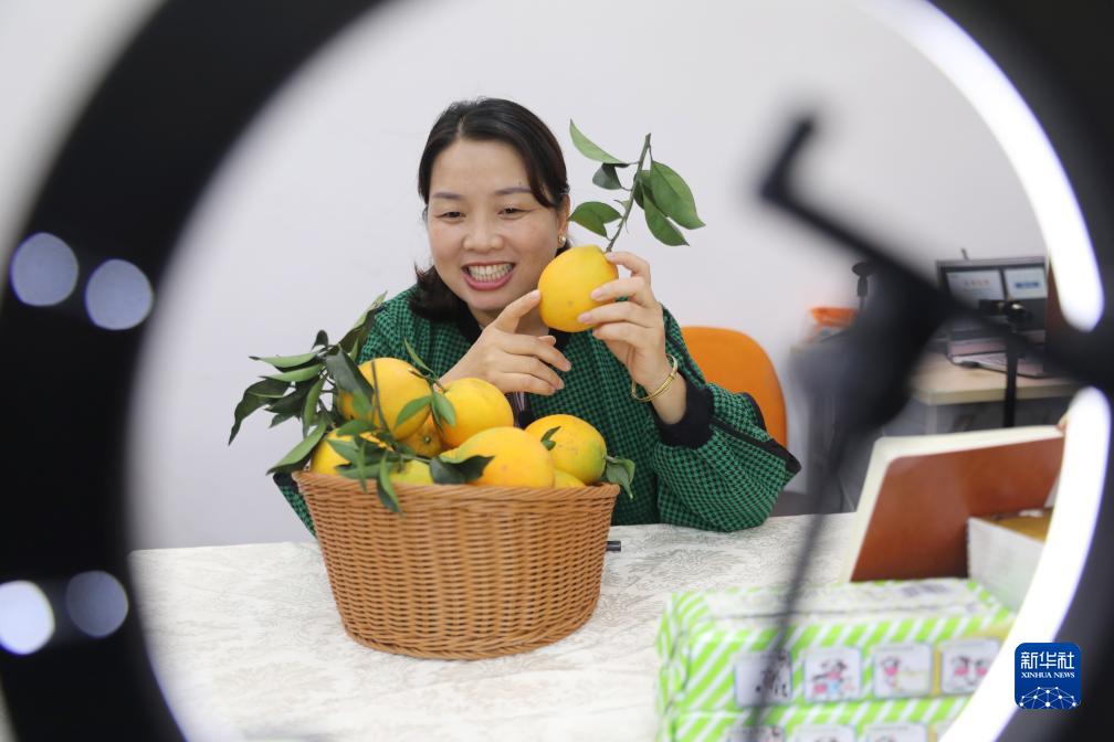 11月11日,在湖南省永州市道縣道滋味有限責任公司,主播在網(wǎng)絡(luò )平臺上推廣當地臍橙。