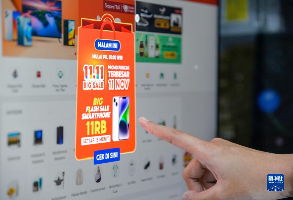 11月10日,在印度尼西亞雅加達,員工在“美麗珍珠商店”查看一家電商網(wǎng)站的“雙十一”購物節促銷(xiāo)信息。