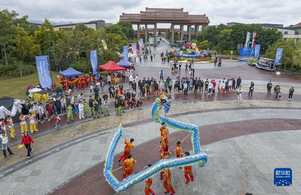 11月11日,在浙江省溫州市三垟濕地公園北廣場(chǎng),舞龍隊選手在比賽中(無(wú)人機照片)。
