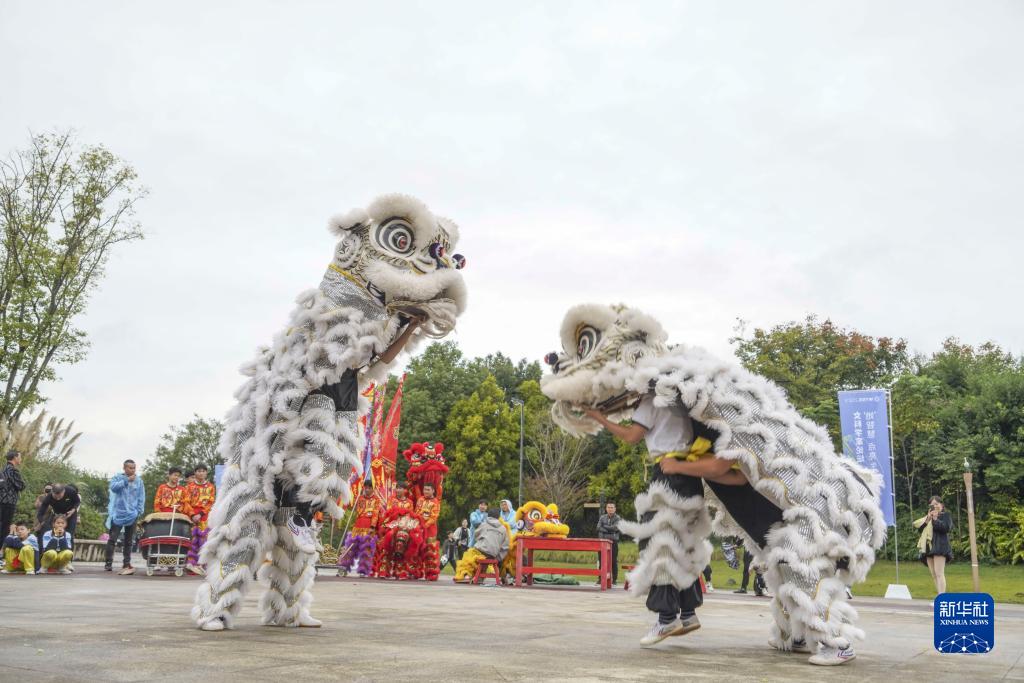 11月11日,在浙江省溫州市三垟濕地公園北廣場(chǎng),舞獅隊選手在比賽中。