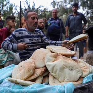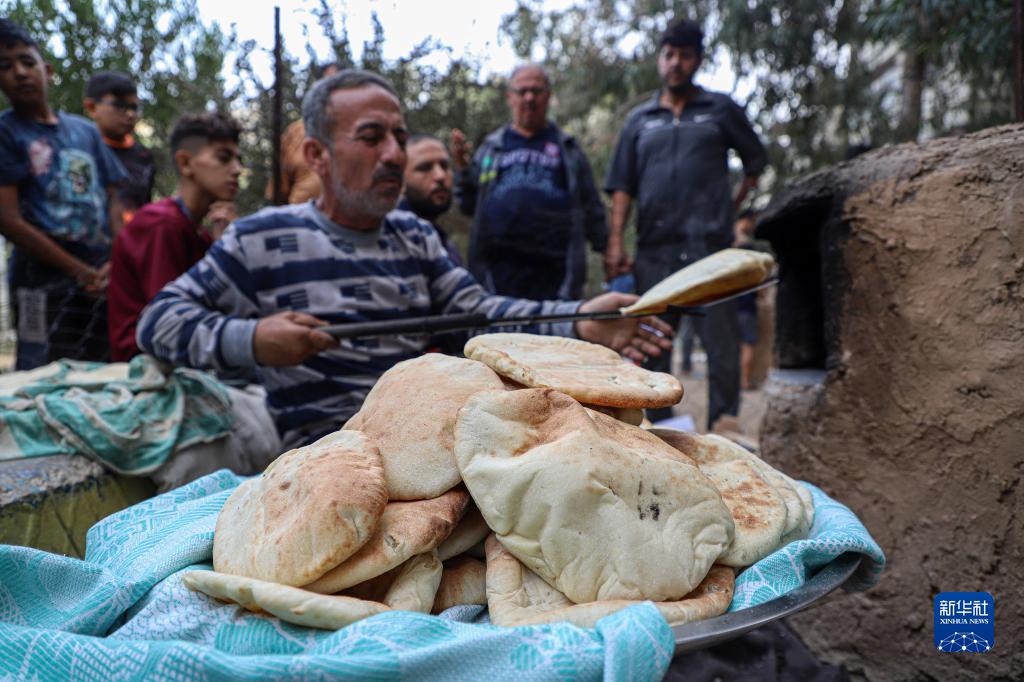 11月11日,在加沙地帶南部城市汗尤尼斯,志愿者為無(wú)家可歸的巴勒斯坦人制作大餅。