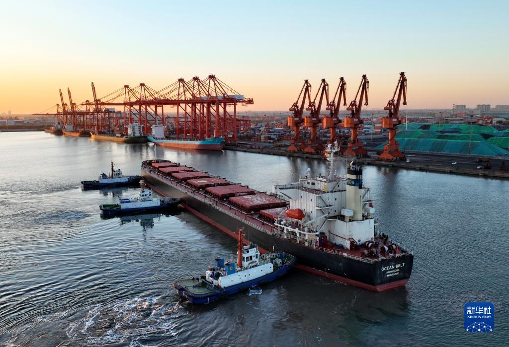 11月11日,一艘輪船在拖輪的協(xié)助下向唐山港京唐港區礦石碼頭靠泊(無(wú)人機照片)。