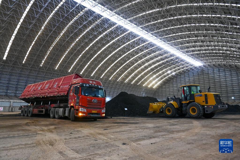 在位于新疆伊爾克什坦口岸的儲配煤保稅庫,車(chē)輛卸載來(lái)自吉爾吉斯斯坦的進(jìn)口煤炭(11月7日攝)。