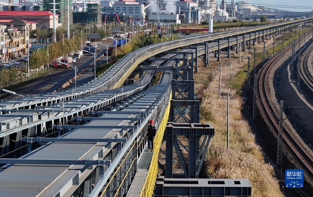 11月12日,工人在唐山海港經(jīng)濟開(kāi)發(fā)區管帶機廊道橋架上巡檢(無(wú)人機照片)。